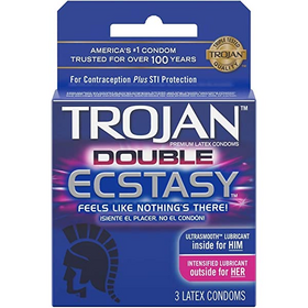 TROJAN Double Ecstasy Lubricated Condoms are larger in size and feature a revolutionary design that lets you feel the pleasure, not the condom. Base is tapered to provide secure fit. Each condom is electronically tested to ensure reliability.